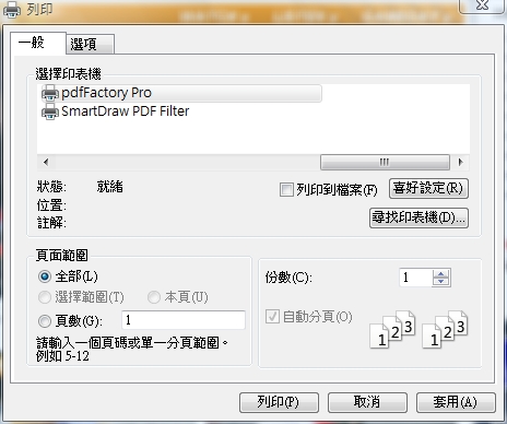2. 選擇列印功能,選到我們那可愛的pdfFactory Pro印表機